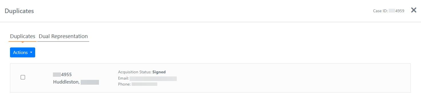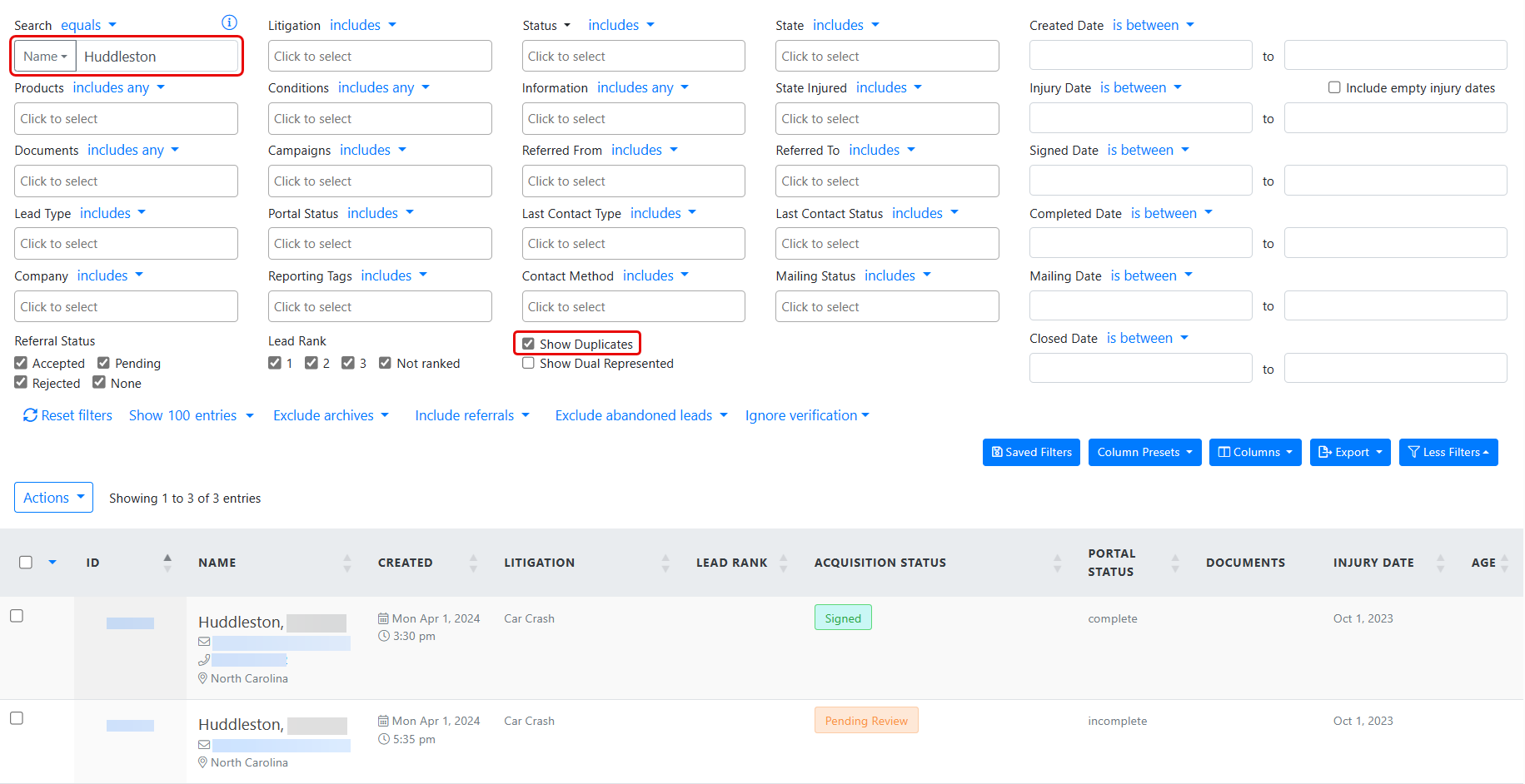 Figure 2 shows an example of duplicate cases that show up when the user filters on the last name “Huddleston” and selects the Show Duplicates checkbox. In both cases, the clients have the same first and last name, email address, and litigation type. The phone number is missing from one case, but because they share the same email address, the cases are considered duplicates.