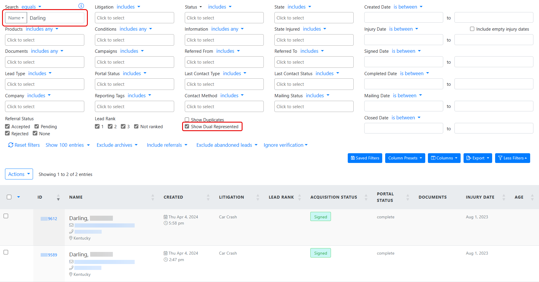 Figure 7 shows an example of dual representation cases that show up when the user filters on the last name “Darling” and selects the Show Dual Represented checkbox. In both cases, the clients have the same first and last name, email address, phone number, and litigation type. Both cases also have the “Signed” acquisition status.