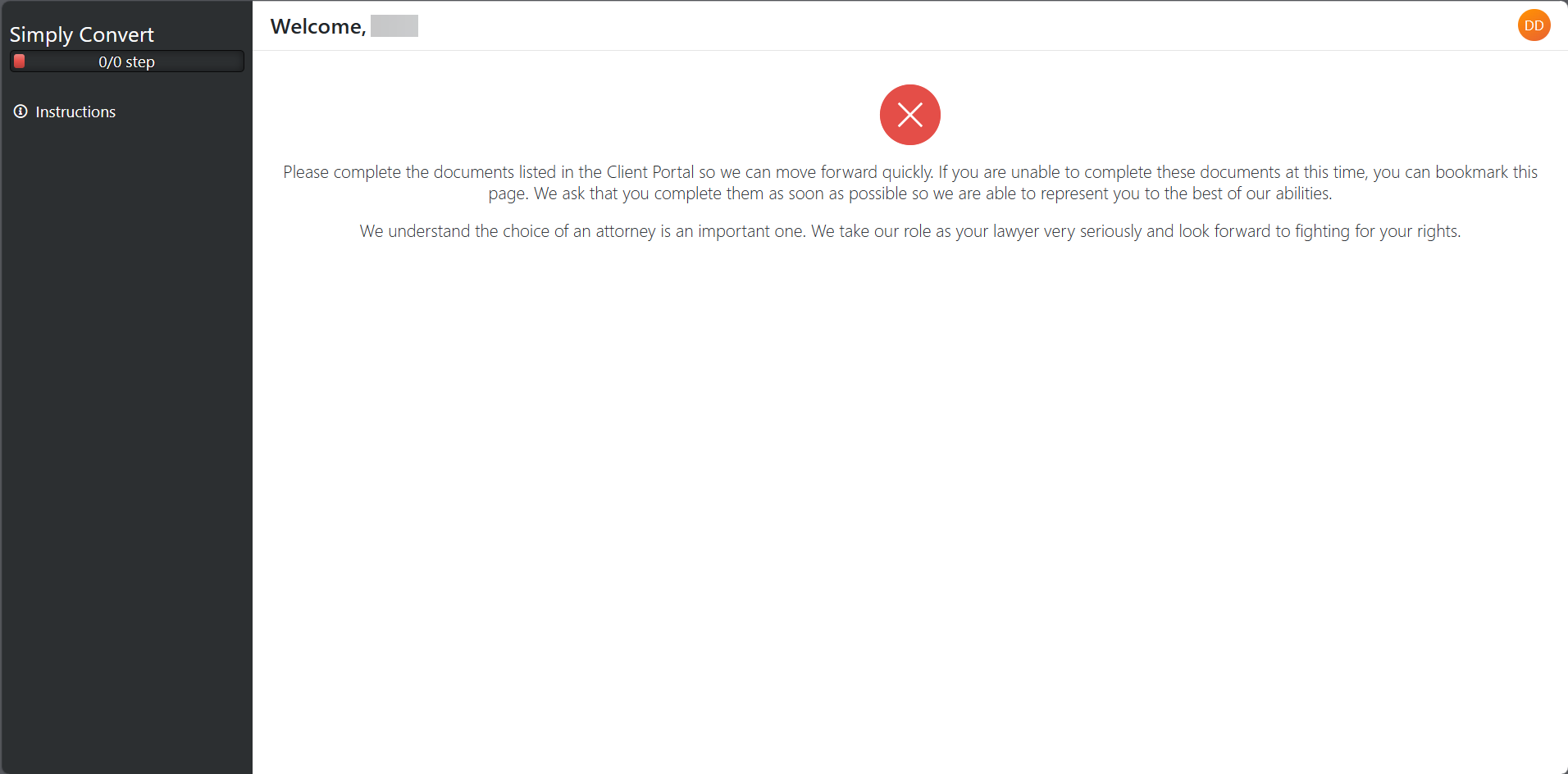 Figure 6. The client portal after the retainer agreement has been sent to it.