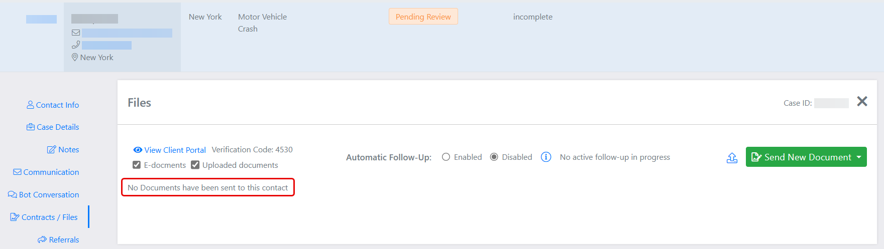 If SimplyConvert is not configured to send an agreement automatically, the client portal remains empty (Figure 4), and the Files tab for the client’s case shows that no documents have been sent (Figure 5). The portal and the Files tab stay that way until you manually send an agreement.