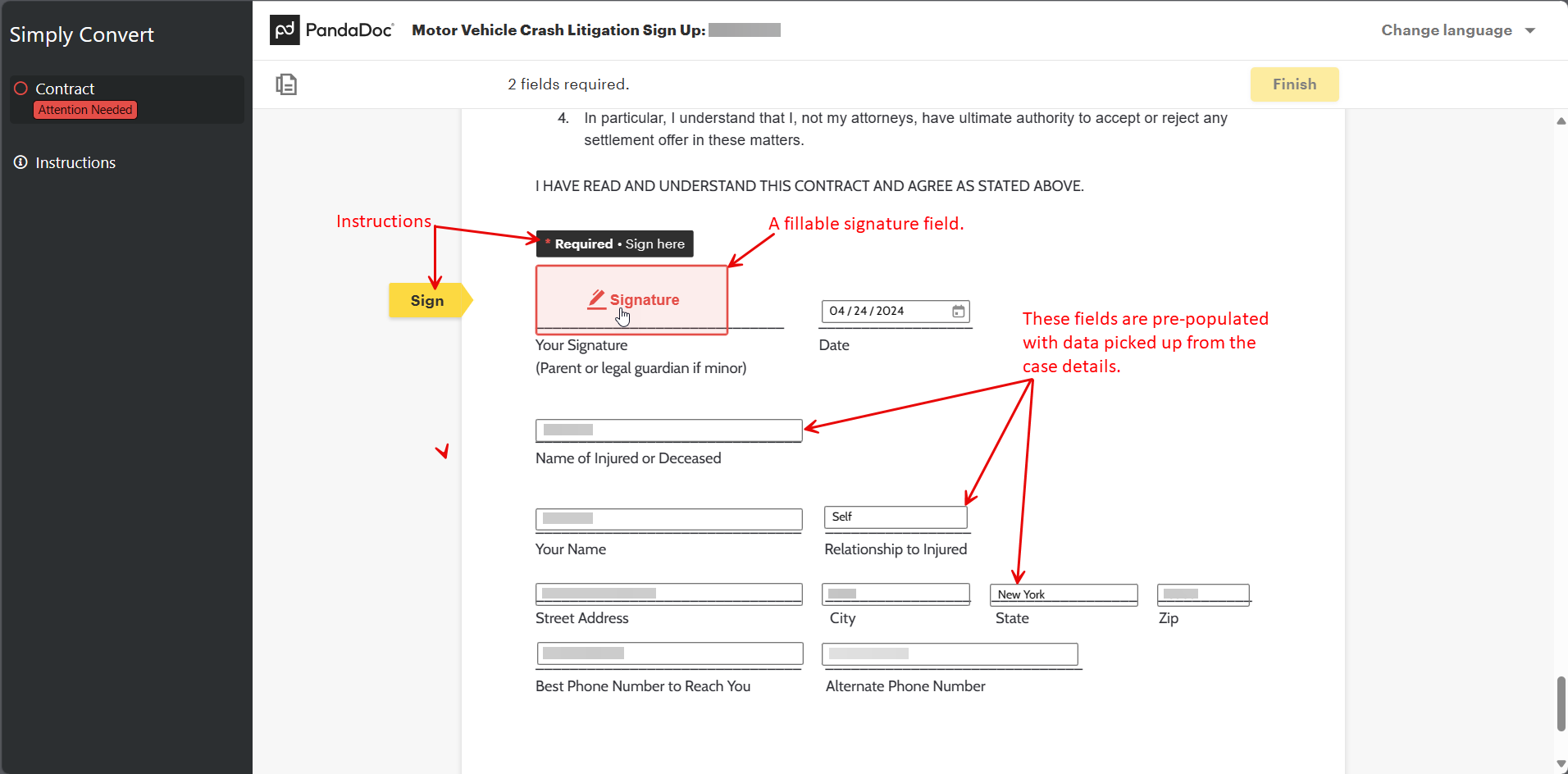 As soon as a case is added to SimplyConvert, the system creates a unique, web-based client portal for the prospective client or authorized representative identified in the case information. The portal enables your firm to share important case documents—such as your retainer agreement, authorizations, and others—with the client in digital (PDF) format. The client can then open the documents in the portal and take whatever action is required, such as providing a signature or completing fields of required information.