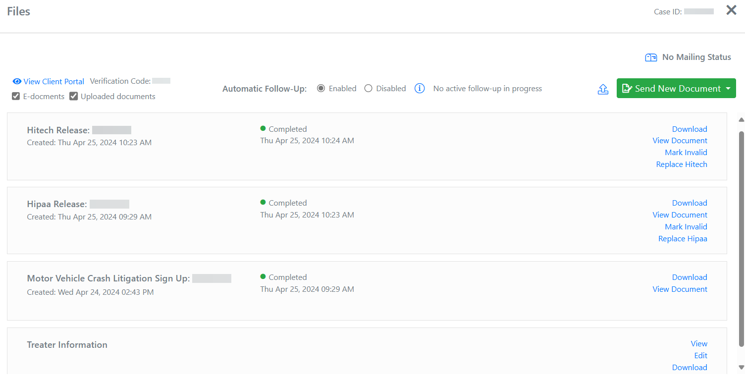 Again, the client follows the on-screen directions to complete each document, and the Files tab updates each document’s status as “Completed” (Figure 11). Although the Treater Information does not show the word “Completed,” you can click the View or Download button to see the information, which also appears at the bottom of the Case Details tab.