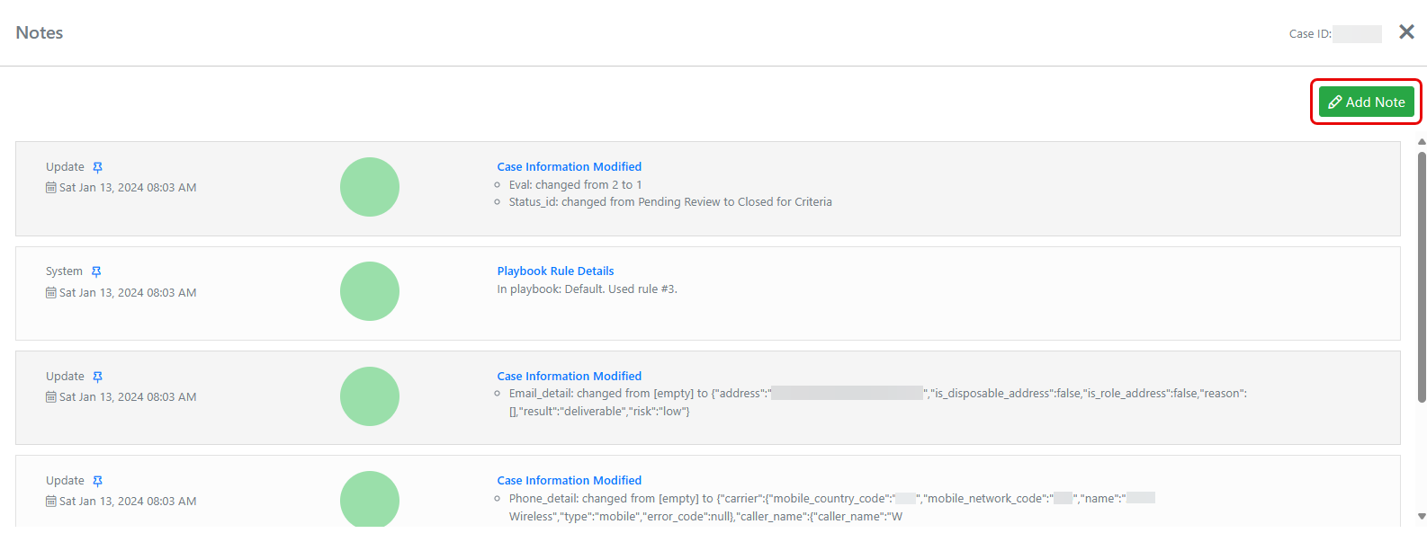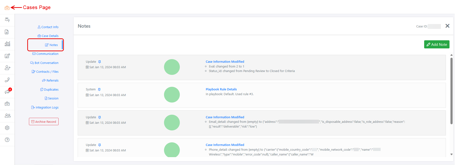 Figure 1. The Notes tab, displaying notes about a case. (Some data is blurred for privacy.)