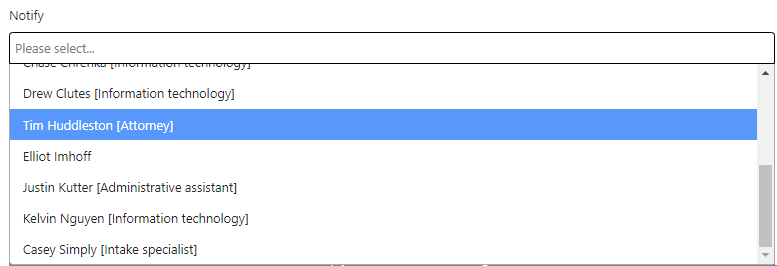 - If you want someone at your firm to receive an email notification about your new note, click the Notify field and select the person’s name (Figure 14). Click the field again to select another name.